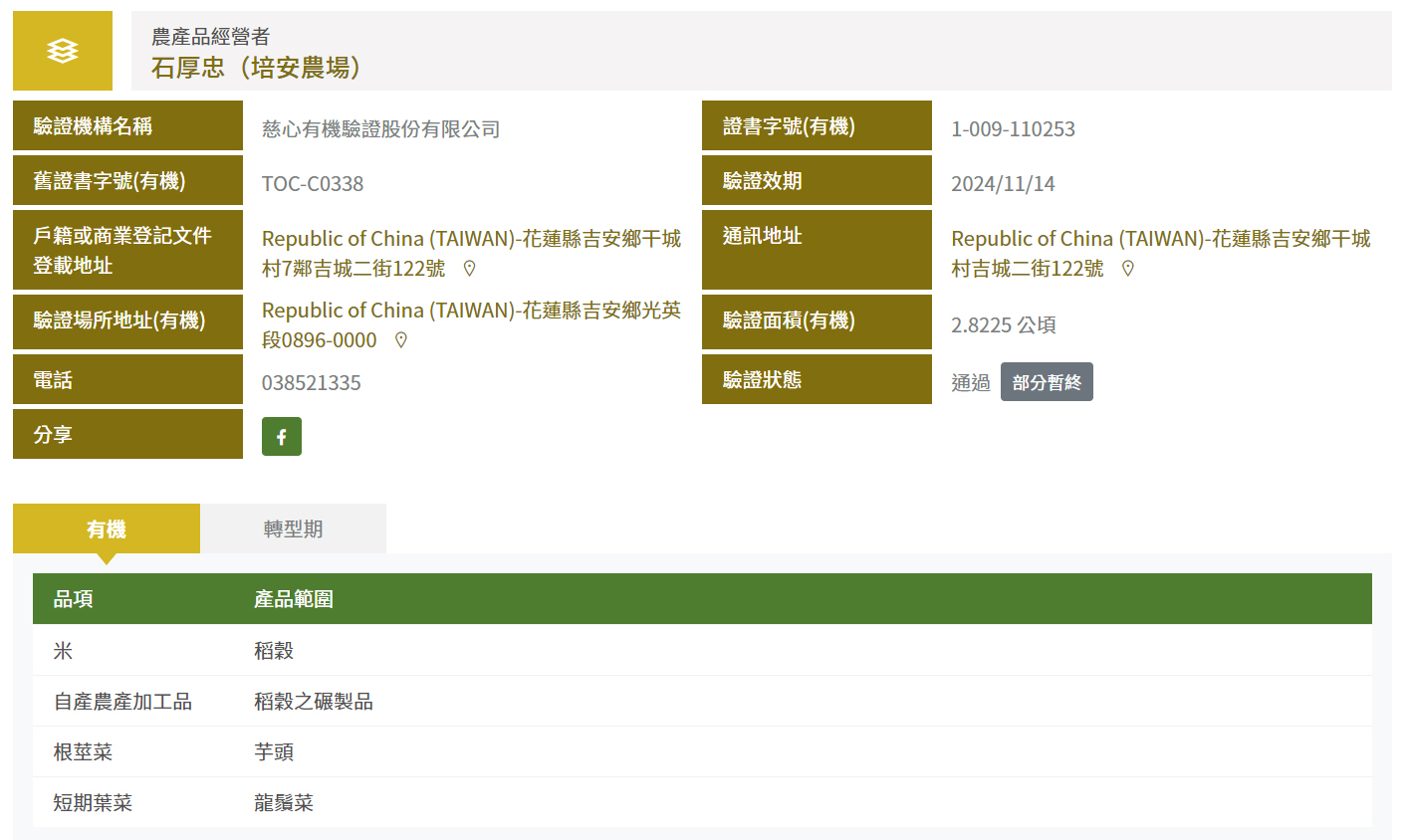 種植產地:花蓮縣吉安鄉 培安有機農場
